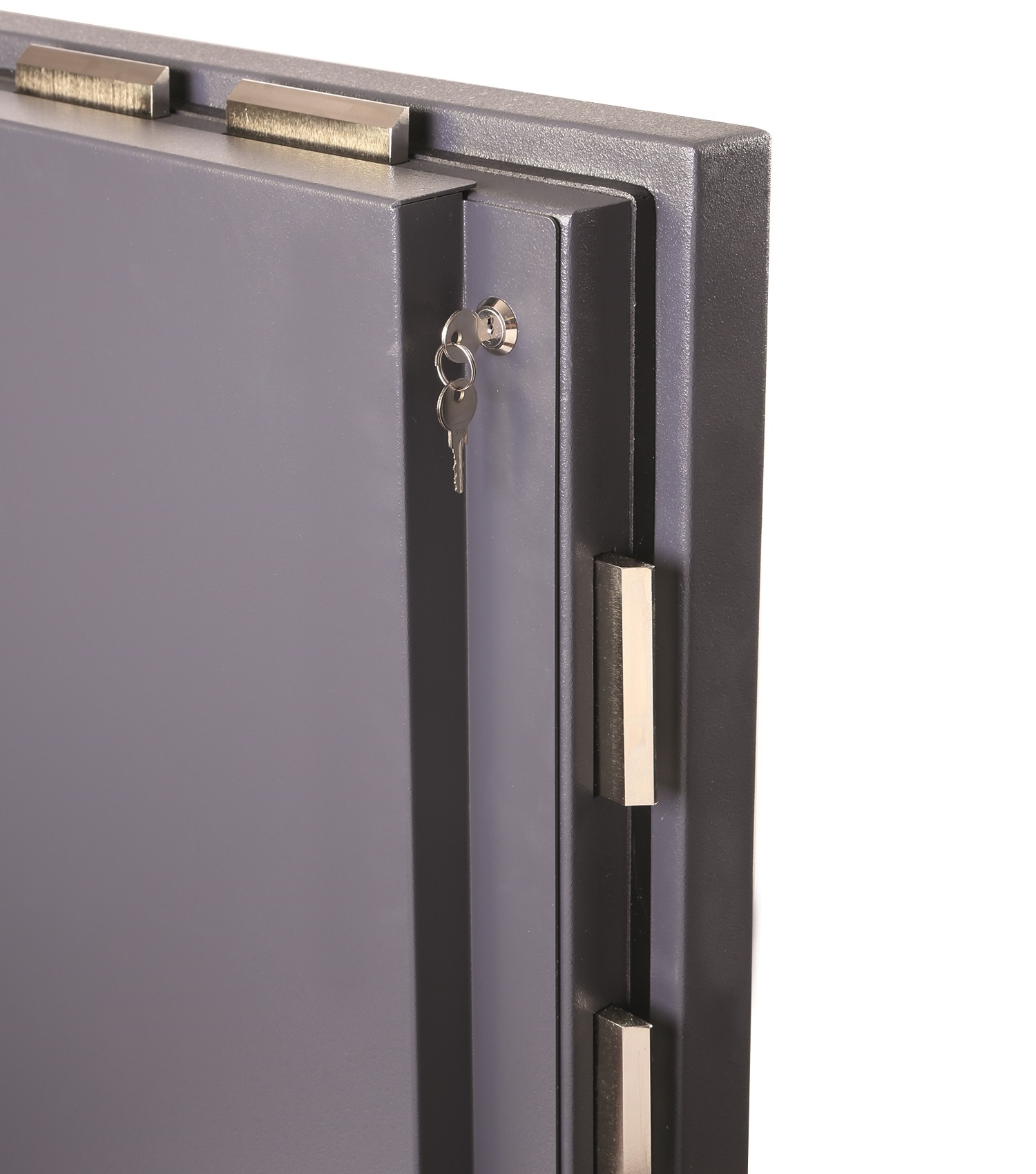 ― огнестойкость класса LFS 30P по евростандарту EN 15969, обеспечивающая гарантию защиты денежных знаков и документов от доступа огня не менее получаса при 1000°C (в реальных условиях подобная температура при возгорании не достигается). - Дверь на мощных внешних петлях раскрывается на 180 градусов. Её конструкция содержит ряд специальных технологических решений, направленных на защиту от выдавливания гидравлическим устройством, выбивания, распиливания петель, вырезания замков и иных способов повреждения.